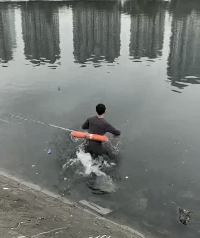 “河水太急了,根本站不住脚!”唐琪回忆,当时路人们已经准备好了救生圈等工具,但还无人下水,他着急地指挥:“我来,把救生圈绑我身上,我下去!”就这样,唐琪第一次入水,但湍急的水流让他无法接近女孩,反而往下沉,他只得奋力游回岸边。稍作调整后,他再次扎入水中,艰难从上游往下游挪动,游向挣扎的女孩。靠近后,他拼尽全力将女孩拖至河边一块石头上。然而,原本携带的救生圈被磨破,救生绳也因过度拉扯紧绷差点断了。危急之下,唐琪只能一手死死拉住女孩,一边在冰冷河水中等待救援。