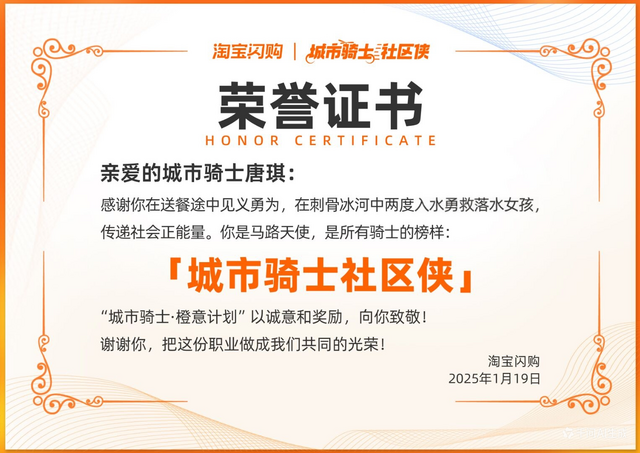 唐琪的义举引发社会广泛关注,其所属外卖平台淘宝闪购迅速响应,1月19日晚,记者从平台获悉,为鼓励见义勇为行为,淘宝闪购授予了唐琪“城市骑士社区侠”荣誉称号,并颁发了5000元现金奖励。