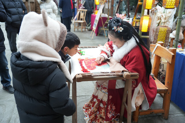 在各个非遗工坊和互动舞台,兼收并蓄的阆中王皮影、蜀锦的流光、蜀绣的细腻、成都漆艺的温润、青神竹编的精巧,还有绵竹年画、阆中刺绣等数十项非遗技艺集中亮相。观摩团沉浸式体验互动,感受传统技艺魅力,提升文化遗产保护意识。