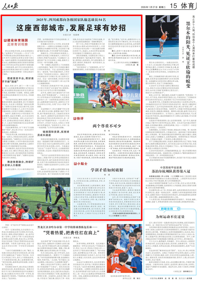 职业足球稳步发展,业余足球氛围火热,“金牌球市”声名远扬……作为“十四五”时期首批全国足球发展重点城市之一,近年来四川成都的足球事业发展可谓火热。2025年成都累计向各级国家队输送球员54名,成都蓉城足球俱乐部球员胡荷韬在近日举行的U23男足亚洲杯中表现亮眼……丰硕的成果,离不开扎实的足球青训。这座足球发展重点城市有什么妙招?如何让更多孩子绽放足球梦想?本报记者进行了调研。