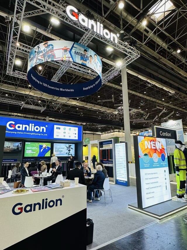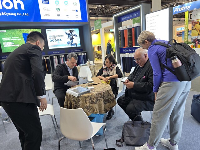 “A+A”德国国际职业安全与健康展览会现场,佳联印染展出最新款产品,受到海外客户关注。(受访者供图)