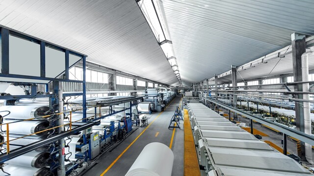 临近中午12点,正是车间工人吃饭时间。人没在,但几百米长的生产线却依旧在飞速运转,布匹在铁器上丝滑流转,像是在轻盈“飞舞”的空中丝带。