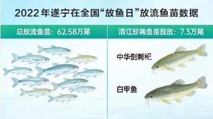 2022年,遂宁市在全国“放鱼日”放流各类鱼苗62.58万尾,其中向涪江投放中华倒刺鲃、白甲鱼等珍稀鱼苗7.3万尾。