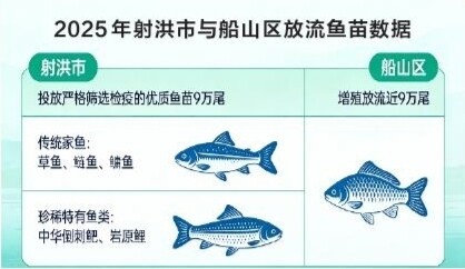 2025年,射洪市在“放鱼日”活动投放经严格筛选检疫的优质鱼苗9万尾,包括草鱼、鲢鱼、鳙鱼等传统“家鱼”,以及珍稀特有鱼类中华倒刺鲃、岩原鲤。船山区亦增殖放流近9万尾。
