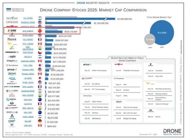 近日,国际权威无人机行业研究机构德国Drone Industry Insights(Droneii)发布了2025年度全球无人机上市公司市值排名。成都企业纵横股份成功跻身全球无人机上市公司市值排名Top4,为此次榜单中唯一上榜的中国企业。