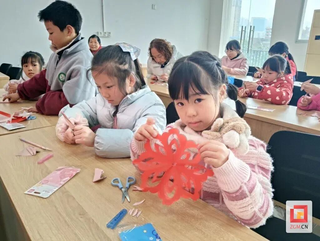 随后的趣味创作实践将活动推向高潮。在童伴妈妈和志愿者的耐心指导下,孩子们拿起红纸与剪刀,认真折叠、精心裁剪。有的孩子按照传统纹样细心雕琢,有的孩子发挥想象力,尝试设计属于自己的独特图案。专注的神情、小心翼翼的动作,尽显孩子们的投入与创造热情。