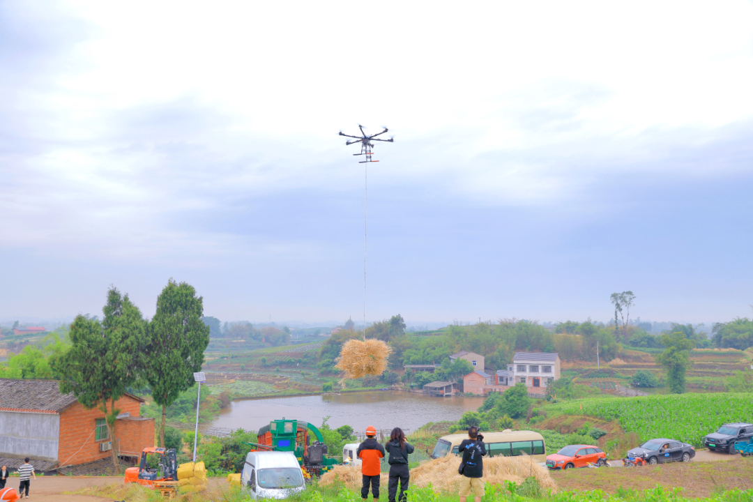 在龙潭镇道澄村,新收的秸秆被打成规整的方捆,六旋翼的重载无人机嗡嗡起飞,一趟就能吊运几十斤,翻山越岭,精准落到集中点。原本靠人挑车拉,费时费力,现在无人机几分钟一个来回,运输效率提高六成,成本还降了一半多。