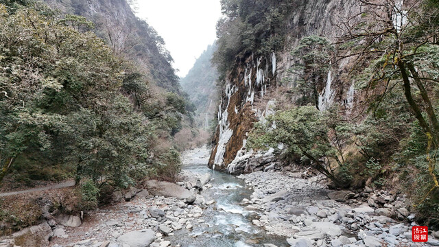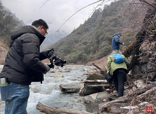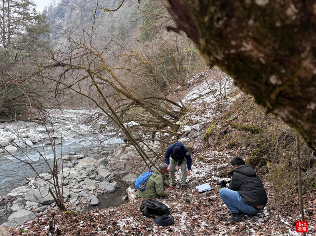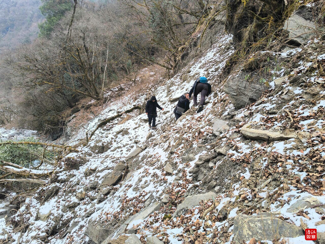 循着水声走向泗耳沟深处,巡护队伍攀爬上近乎垂直的陡坡,踏过覆冰的河滩,被一道三十米宽的急流拦住去路。