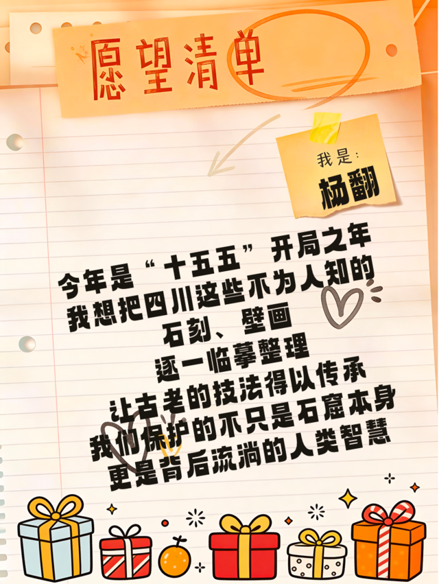我是杨翻。今年是“十五五”开局之年。接下来的五年,我想把四川这些不为人知的石刻、壁画,逐一临摹整理,让古老的技法得以传承。我们保护的不只是石窟本身,更是背后流淌的人类智慧。