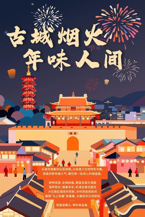 2月15日至2月23日,建昌古城将举行“马跃建昌城,灯映盛世春”建昌古城喜迎新春活动;2月18日,将举行舞龙、大蜡会、木偶等民俗巡游,现场将派送上千份西昌非遗大汤圆。同时,在建昌古城大通门外广场,将有“神马月驰巡游记”全域沉浸式游戏等你参加。