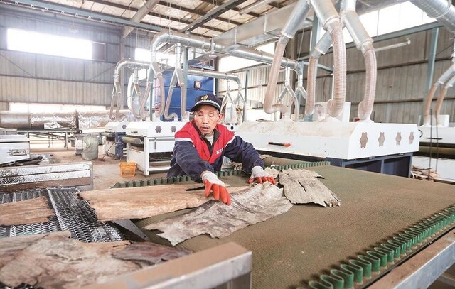 工人对杜仲皮压平整形。