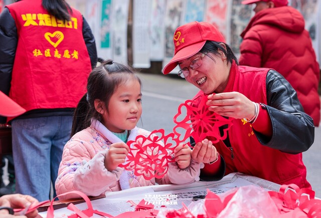 会场外,社区工作者搭起游艺体验区,志愿者带着娃娃们制作手工剪纸、下跳跳棋,老年书法爱好者即席挥毫,笔走龙蛇间,“福”字斗方与吉祥春联跃然纸上,盛满新春祝福。