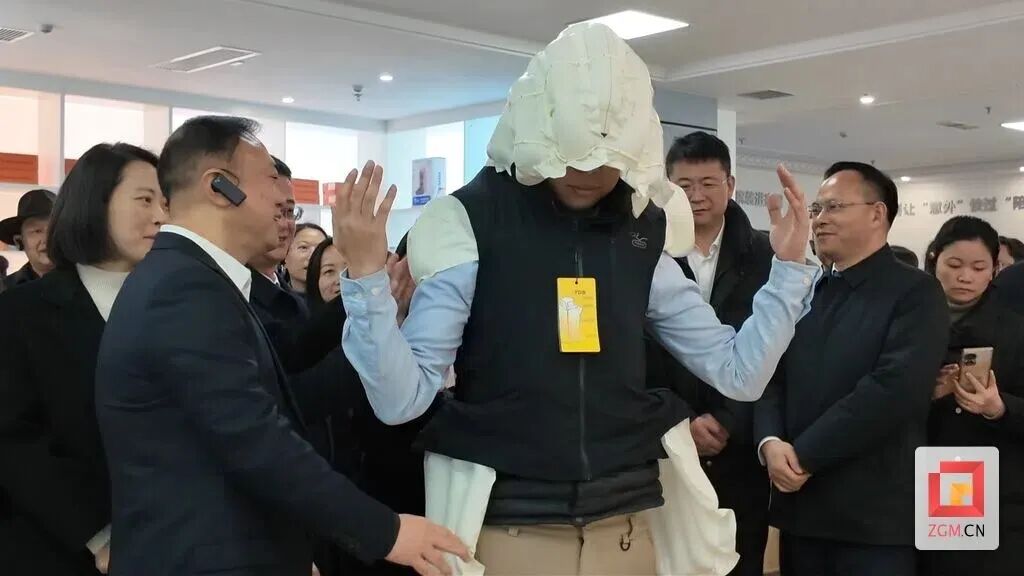 另一侧,工作人员演示的“高危人群跌倒保护远程报警马甲”引发关注,佩戴者在模拟后仰跌倒时,安全气囊瞬间弹开并自动报警,实现风险识别、即时防护与智能报警一体化。