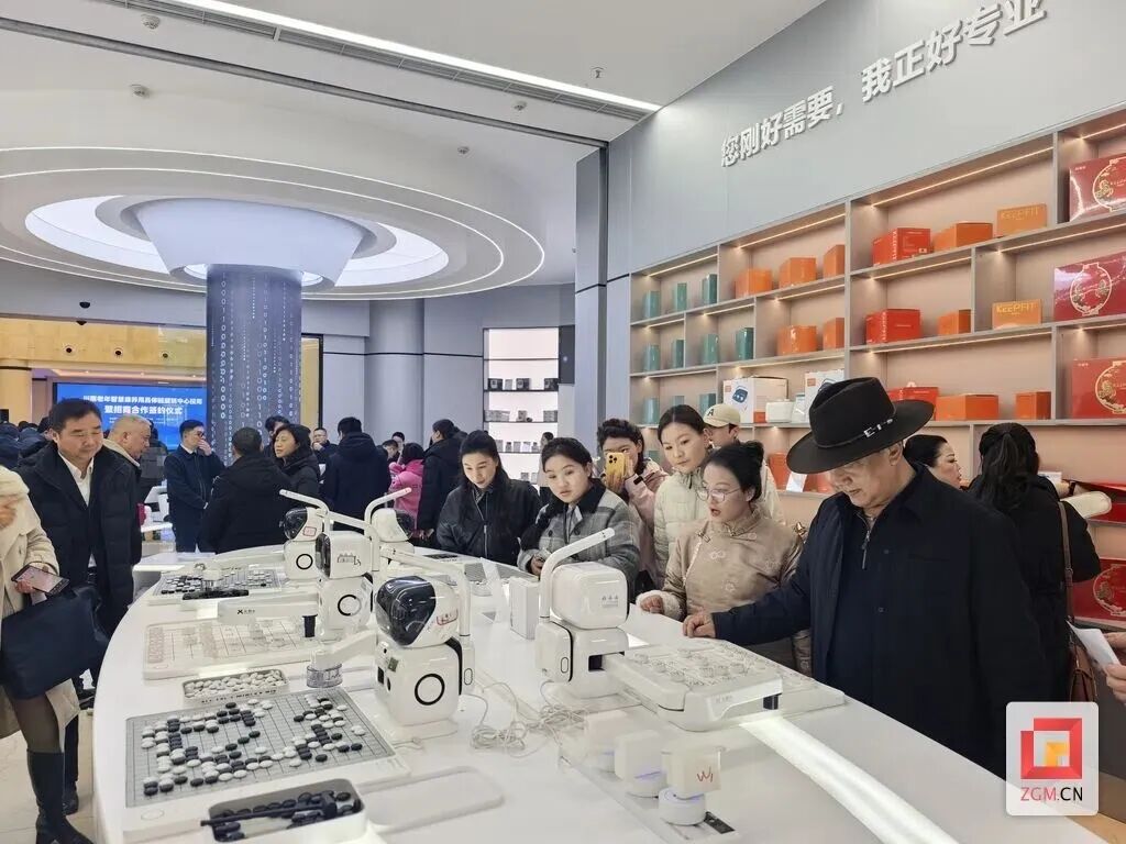 展销中心内,前来参观的市民与企业代表络绎不绝。70岁的李爷爷正与一台智能下棋机器人专注对弈,吸引了大家的围观。他笑称:“这‘老伙计’可不简单!”该机器人具备对弈、交流与难度调节功能,成为现场“明星产品”。