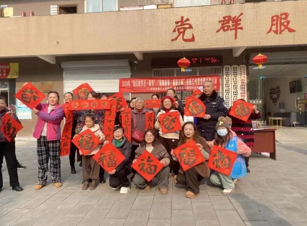 当天,广场上红灯笼高挂,处处洋溢着喜庆的气氛。来自自贡市第三人民医院和社区的书法爱好者挥毫泼墨,写春联、送福字,现场墨香四溢,温馨满满。