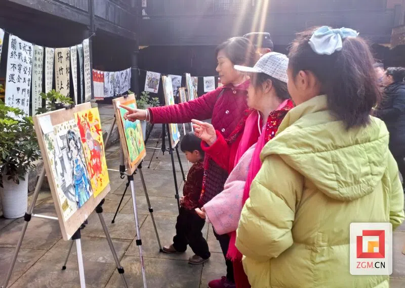 现场,一幅幅充满童真童趣与创意巧思的作品摆放在古建筑院坝里。记者了解到,此次一共有100余件优秀青少年书画作品进行展出,涵盖书法、美术两大类别,题材丰富、形式多样,呈现出贡井区青少年书画教育的丰硕成果。书法作品中,篆、隶、楷、行、草各体兼备,笔墨间尽显少年学子的书法功底与艺术感悟;美术作品囊括中国画、水彩等多种形式,色彩与线条交织,勾勒出孩子们眼中的美好世界与新春意趣。
