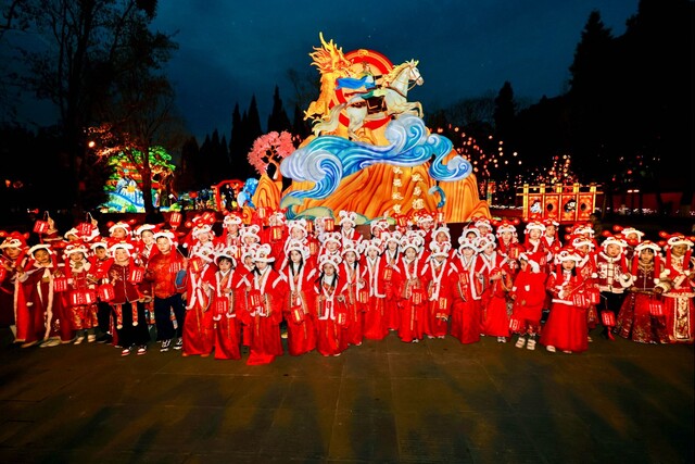 试灯活动现场,一盏盏精美的主题灯组照亮了夜空。作为马年生肖与三国文化的核心交汇点,多达15组马元素灯组成为本届庙会的亮眼标识,灵动造型与吉祥寓意为新春增添满满喜气。