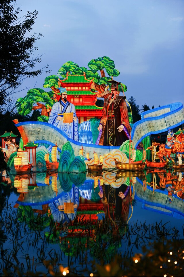 在众多灯组中,多个特色作品脱颖而出,成为全场焦点,彰显出文旅融合的匠心巧思。其中,湖面“君臣之交”灯组规格创下历年之最,以45米长、45米宽、22米高的巨型体量震撼呈现,将三国君臣同心的深厚情谊具象化,成为庙会核心视觉地标。
