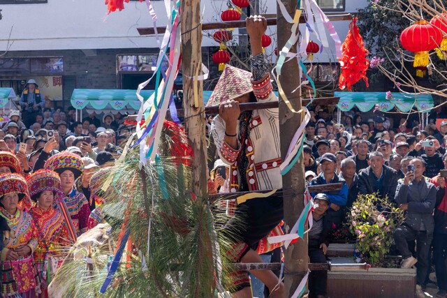 热烈欢腾的民族歌舞与走秀中,“上刀山、下火海”民俗绝技格外震撼:傈僳勇士赤脚踩过通红犁头,徒手攀上20米高的刀梯,赢得台下阵阵惊呼与掌声。