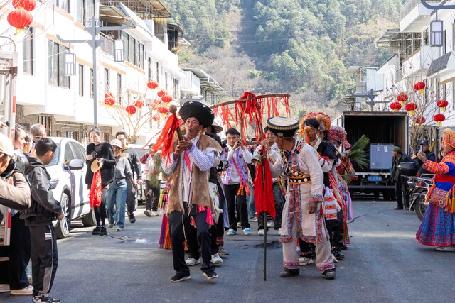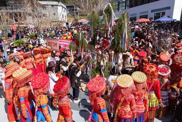 印有“古韵永兴 傈僳阔时”的红色拱门下,新鲜松毛清香弥漫。葫芦笙悠扬响起,傈僳长者吟唱古老曲调,健硕的汉子抬着扎红绸的年猪踏舞而行,盛装妇女与游客紧随其后……下午2时许,阔时节正式开幕。千余人组成的队伍如长龙般走向主舞台。现场松枝虬劲、彩带飘舞,杀年猪、撒糖果、挂松枝等传统仪式依次展开,寄托着群众对新年风调雨顺、产业兴旺的美好期盼。