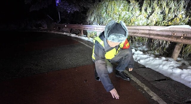 此前2点出发巡查的队员传回消息:海拔1800米左右的“36公里处”,道路结冰,厚度1厘米,越往上越厚,存在安全隐患。