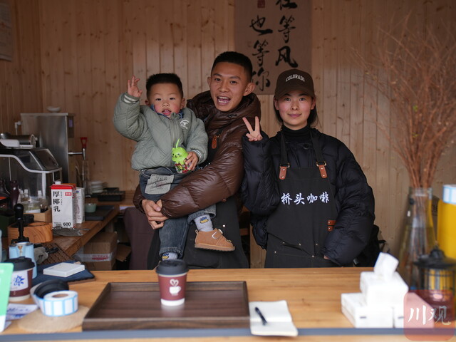 “节前销量涨了3倍,最高一天能卖140杯。”王松涛制作咖啡、妻子张罗、三弟在厨房择菜、两岁儿子在坝子玩球,忙得不可开交。