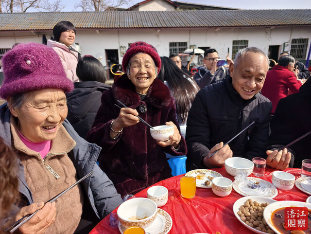 正午时分,“团圆坝坝宴”正式开席。红烧鱼、咸烧白、回锅肉、粉蒸肉、酥肉汤……菜品陆续上桌,热气腾腾、香气四溢。王伯会数了数,鸡鸭鱼肉样样俱全,“比往年多好几道菜呢!”