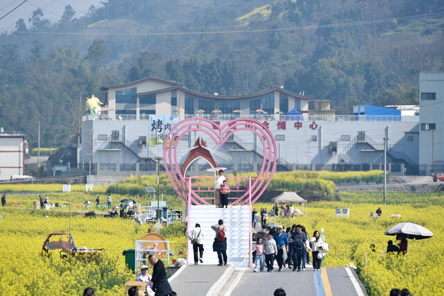 2月14日,阳光洒落在高县庆岭粮油现代农业园区,万亩油菜花海熠熠生辉。彩虹步道上,游客络绎不绝,欢笑声、快门声此起彼伏,人们徜徉于花海之间,尽情感受春日的馈赠。