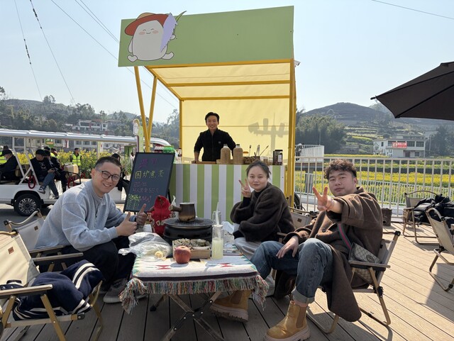 从重庆自驾而来的蒋松林和朋友们正在花田边围炉煮茶。“在重庆天天爬坡上坎,节奏快得很。来到这儿,彻底放松了!”他一边为大家分茶,一边翻看手机里的合影,“就着这万亩花香喝茶,再配上高县土火锅,巴适得板!”