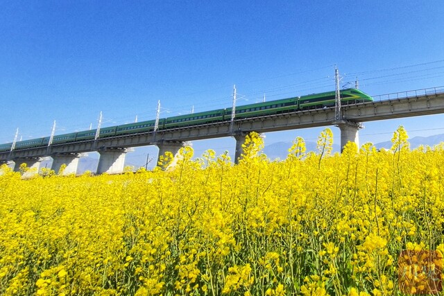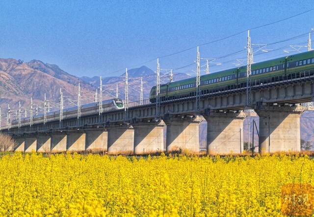 动车组在油菜花花海中穿行。