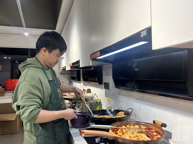 操作台上,各类食材整齐摆放,新鲜蔬菜、肉类、鱼、虾等满满当当。灶台前炉火正旺,艾伦正忙着翻炒锅中的排骨,汤汁在高温下慢慢收汁,香气四溢。作为这场年夜饭的主厨,艾伦表示,中国人常说“民以食为天”,在他看来,一顿热气腾腾的饭菜,最容易拉近人与人之间的距离,用聚餐的方式把大家聚在一起,边吃边聊、互相熟悉,也是他一直以来喜欢的交友方式。