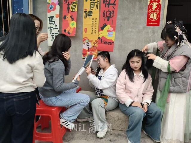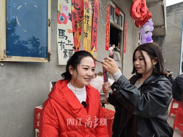 16时许,距离村晚启幕还有3个小时。记者来到黎洁家,她正和村晚演员们一起,在门口“露天化妆间”做妆造。