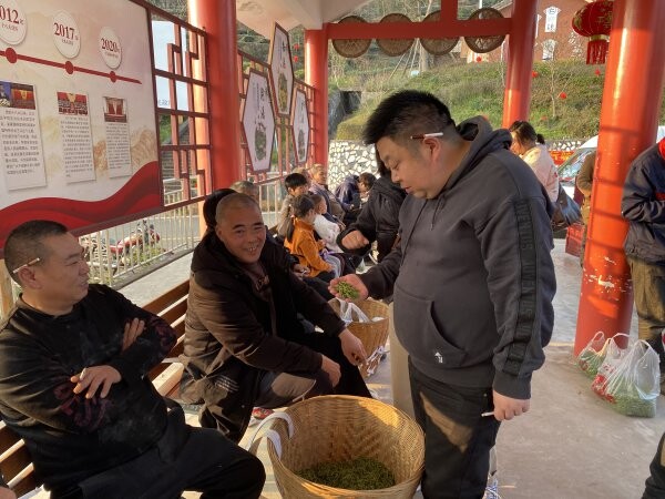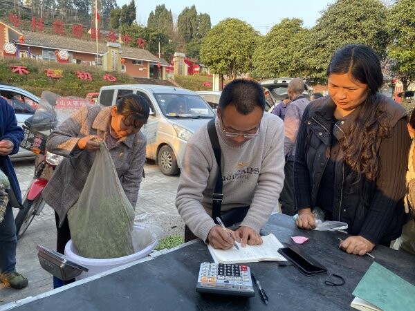 人群中,村民罗德祥手里攥着一张蓝色纸条,满脸笑意地向记者展示,纸条上清晰写着两串数字——“11.3 87”。“这11.3是我今天采的鲜茶重量,87是茶叶价格,刚开市就能有这样的收成,心里太高兴了!”罗德祥笑着说道,语气里满是掩饰不住的喜悦,“新春里能把自家种的好茶卖个好价钱,这一年的日子肯定有奔头。”这简单的两串数字,不仅是他一下午的劳动成果,更是当地村民新春丰收的最直观见证。