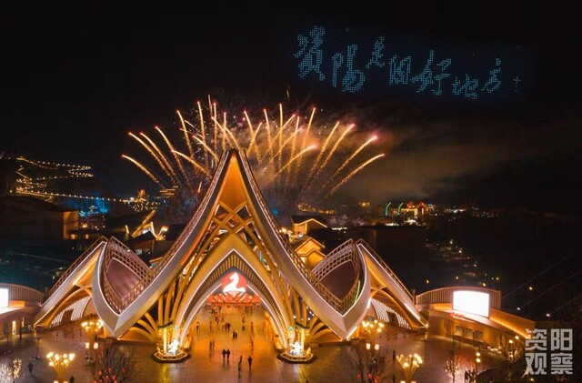 夜晚的方特,科技与光影的碰撞更为绚烂。“侠影新春灯会”上,大型花灯与无人机秀同步上演。数百架无人机升空,在夜空中拼出“马年大吉”“资阳你好”等字样,配合地面烟花绽放,整个园区被光影包围。游客们仰头拍照,无人机编队变换队形时,人群中爆发出阵阵欢呼。