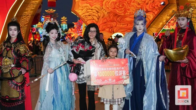 “恭喜您!您是本届灯会第100万名游客!”当天19时许,中华彩灯大世界入园通道前,来自成都的游客杨荑刚刚刷票通过闸机,便被等候在此的工作人员热情包围。鲜花、掌声、闪光灯——突如其来的惊喜让她愣了片刻,随即绽放出灿烂的笑容。灯会主办方工作人员为她送上带有“自贡”元素的城市冰箱贴、“时空龙骑士”公仔等特色文创纪念品,以及自贡灯会、盐业历史博物馆、恐龙博物馆、燊海井等景区门票,并邀请她共同合影,记录下这一难忘瞬间。