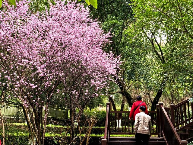 小憩的市民和盛开的桃花相映成趣。曾业 摄