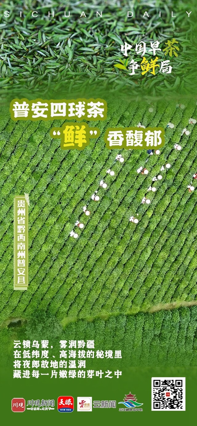 从四川往东南,北纬26°的茶韵延伸至贵州普安县。作为“贵州绿茶第一采永久首采地”,普安县坐拥“世界茶源地”“中国古茶树之乡”双重美誉,是全国为数不多的最早开采早茶产区之一,境内更有2万余株野生四球古茶树,其中千年以上古茶树3000多株。