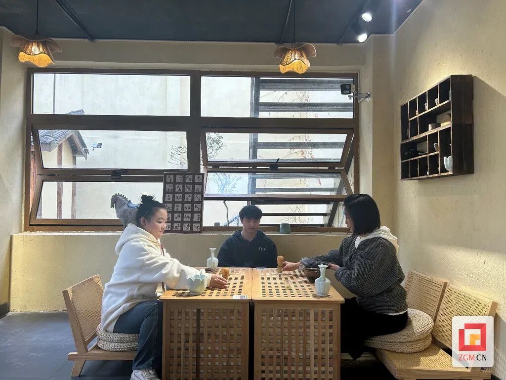 走进艾叶古镇,历史与当下的对话随处可见。在“艾初工坊”内,游客正屏息凝神,用茶筅缓缓击拂茶汤,体验宋代点茶的雅趣。窗外,正是历经风雨的古盐道。一窗之隔,跨越千年的两种生活方式在此奇妙并置。说起与艾叶古镇的缘分,艾初工坊负责人朱婧汐表示,这里文化基底浓厚,同时又充满生活气息。她希望通过点茶、塑陶这类可感知、可参与的方式,将传统文化转化为现代人能够理解并亲近的体验。