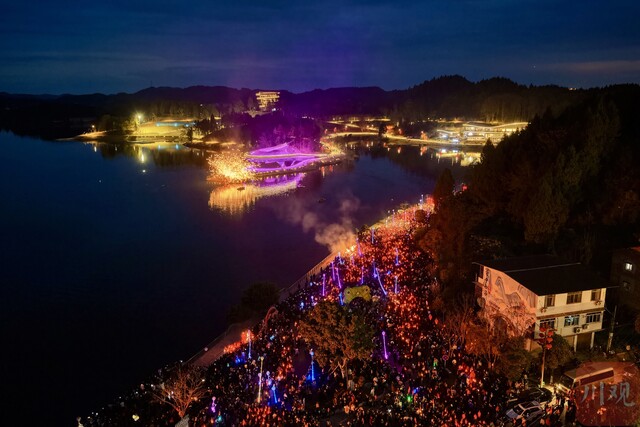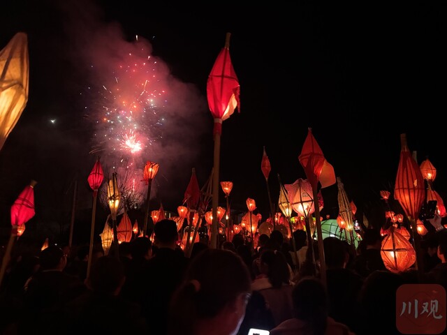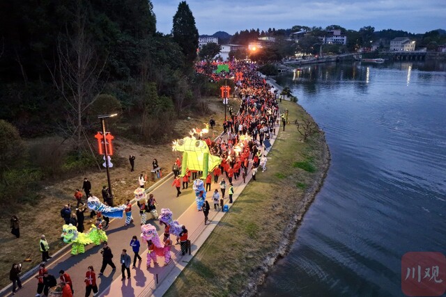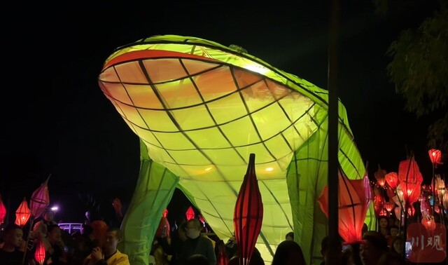 这就是每年正月十四晚上,遂宁、南充等地区流行的地方民俗活动,也是四川省级非物质文化遗产代表性项目——“送蛴蟆”。今年3月2日(正月十四)晚上,在遂宁市蓬溪县赤城湖、南充市西充县莲池镇等地,“送蛴蟆”民俗活动同时上演。数万人手持“蛴蟆灯”,参与这场热闹的民俗活动。
