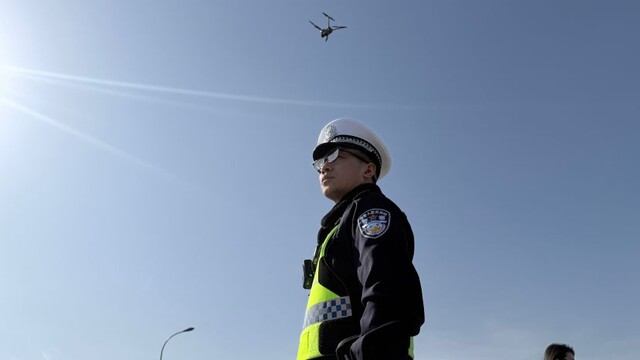 在熊猫基地景区外停车场 警务无人机配合佩戴AI智能眼镜的交警执勤