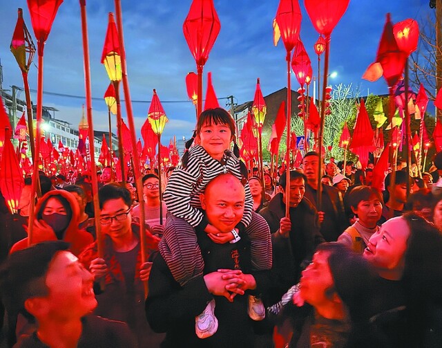 大家唱着古老歌谣,沿着既定路线缓缓前行。人们高声齐唱,声浪穿透夜空,灯光如繁星在夜色中闪烁。从高空俯瞰,长长的队伍宛如一条流动的火龙,不断蜿蜒前行,灯火连成一片,宛如璀璨星河。