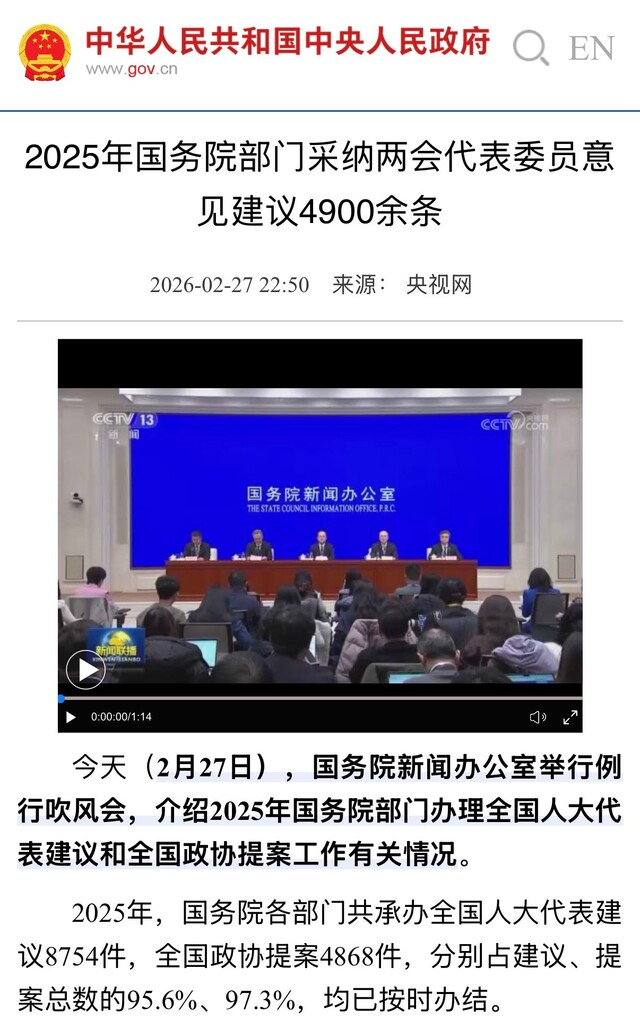 2月27日,国务院政策例行吹风会上的一组数据,让人眼前一亮:2025年,国务院各部门共承办全国人大代表建议8754件,全国政协提案4868件,均已按时办结。其中4900多条“金点子”被吸纳,转化出2200余项实实在在的政策措施。