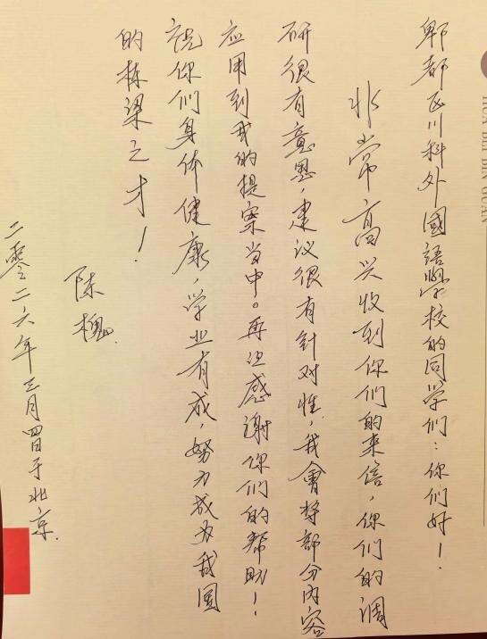 陈槐在回信中说:“我会将部分内容应用到我的提案当中。再次感谢你们的帮助!”