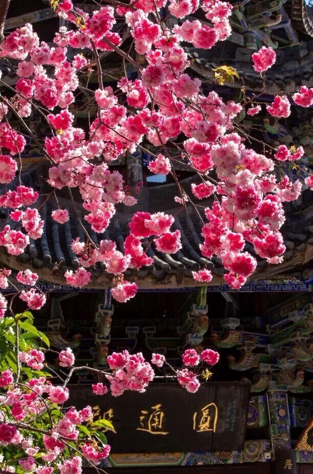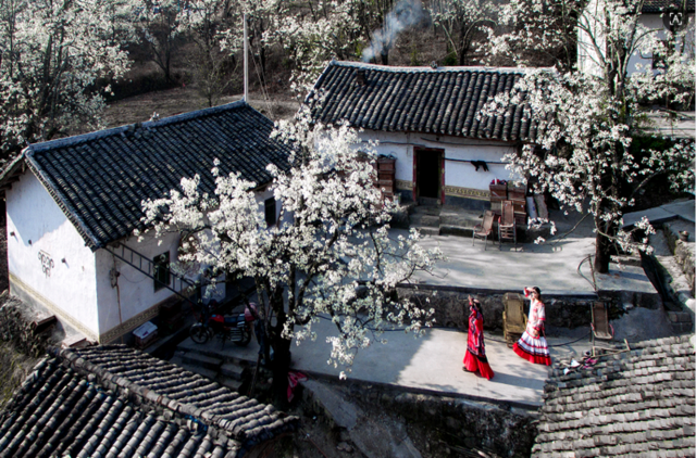 粉嫩花瓣轻拂布依村寨的风雨廊桥,