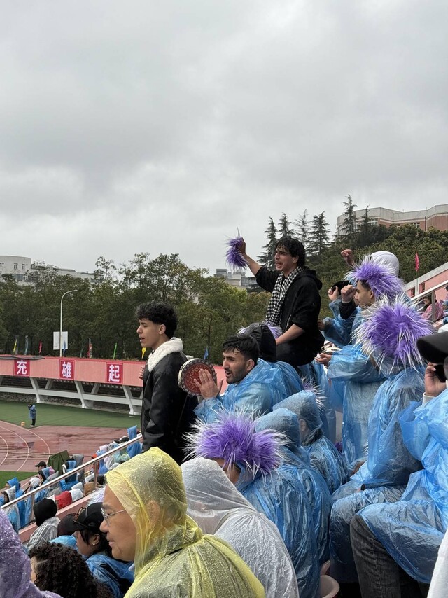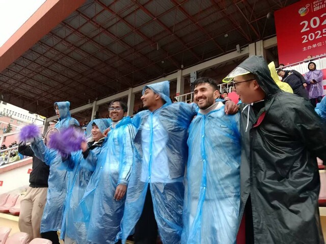 来自孟加拉国、巴基斯坦、阿富汗、摩洛哥等十余个国家的学子们,身披雨衣,手持国旗和手鼓,在寒雨中开启了“花式加油”模式。