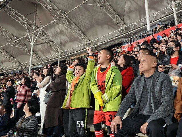 看台中间,9岁的吴俊贤格外兴奋。他穿着达州队红色球衣,不停挥手大喊为主队助威。