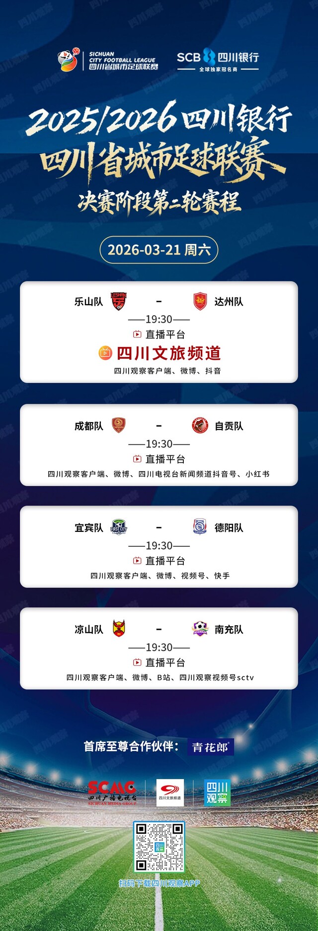 2025/2026四川银行四川省城市足球联赛(简称“川超”)决赛阶段第二轮四场对决将于3月21日(周六)进行。为方便各位球迷朋友观赛,观观整理了比赛日程,请查收!