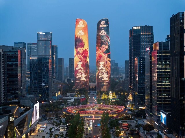 《王者荣耀》与《哪吒之魔童闹海》在成都地标建筑天府双塔联动。成都高新区供图