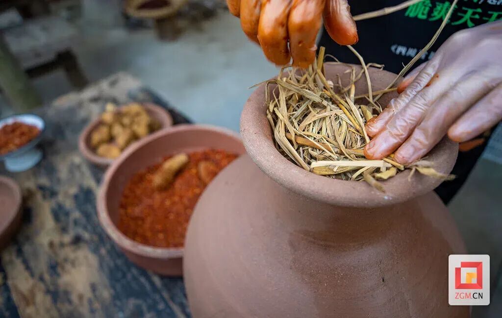 扑坛发酵,是“三腌”的终章,也最显匠心。罗淮良在坛口垫上荷叶,填入菜料,用谷草与篾条封紧坛口,随后将陶坛倒扣于注水的盖沿上。“这叫‘扑坛’。坛底盐重,坛口味轻,这一翻,滋味便在时光里自然调和。”在他身后,四千平方米的古法发酵场内,成千上万口陶坛静默矗立,犹如等待检阅的方阵。坛内,一场无声而深刻的风味转化正在悄然发生。