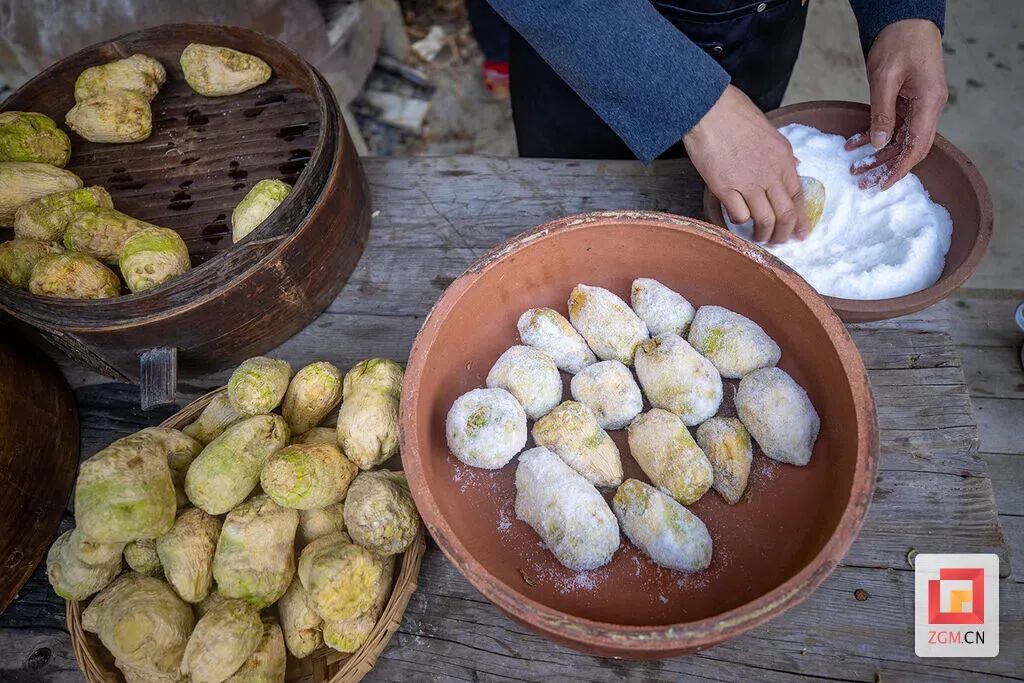 晒制完成的菜头被小心摘下,扁担轻响,挑回那座充满时光印记的非遗工坊。清洗、上笼蒸制,每一道工序都简洁而从容。“火候是活的,全靠经验把握。蒸是为了瞬间杀青与除菌,多一分则软,少一分则涩。”罗淮良一边说,一边将蒸笼端出。热气缭绕间,菜头透出饱满的金黄色泽。